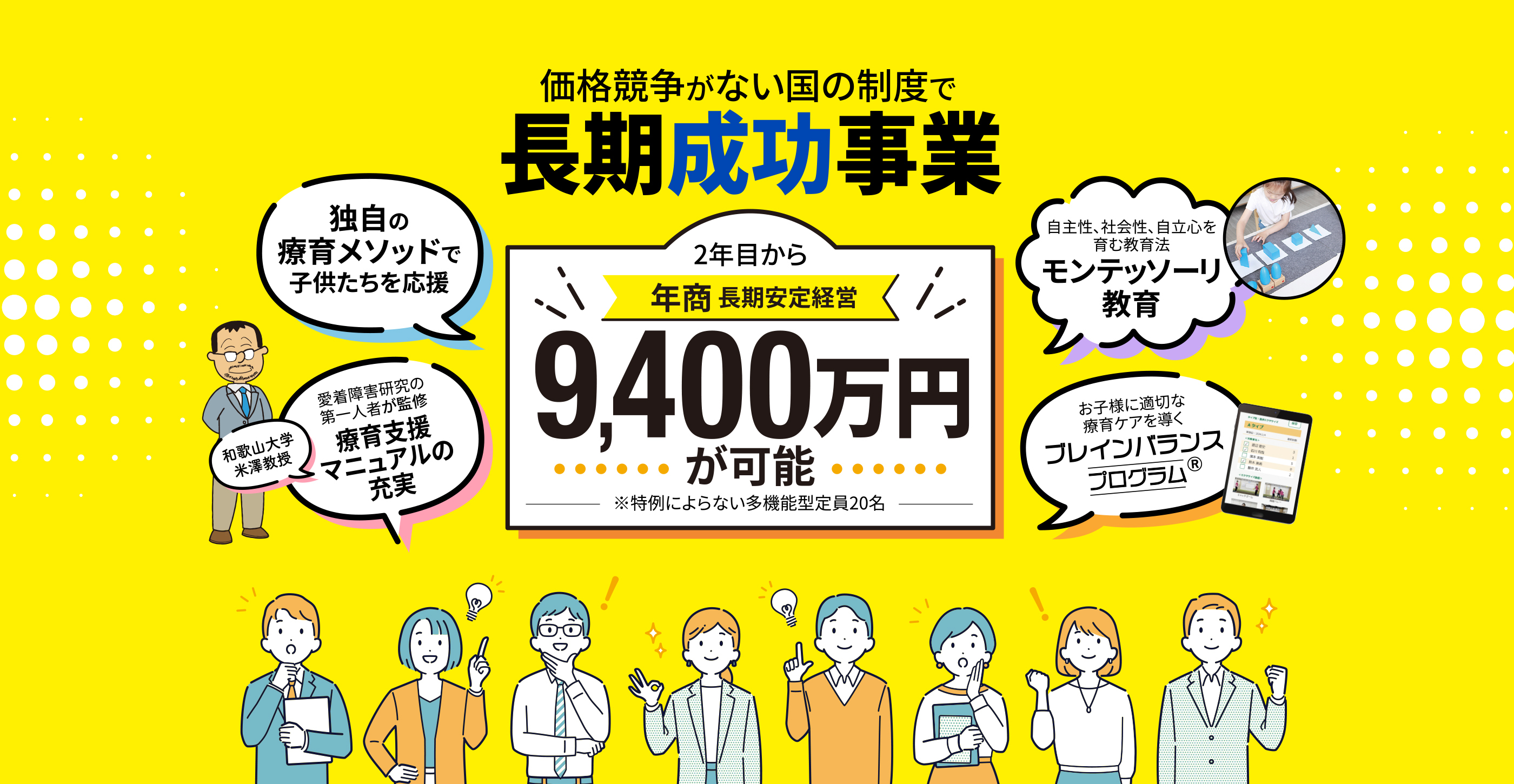 弊社では、最初から全国500教室以上というスケールメリットが使えます。介護事業も行っている本部のバックアップがあることは、スタッフ採用や利用者獲得において特にメリットが高いものです。信用は1日にしてならず。規模感を肌で感じてください!