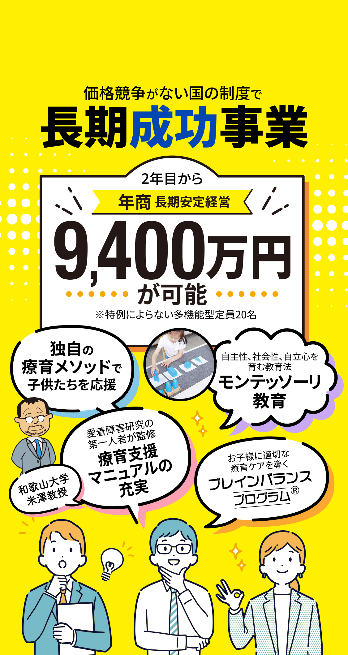 個人で始める。または、法人の新規事業として立ち上げるというのはどうしても信頼度が低く、事業のスタート時点で大きなデメリットになります。自分の子供を預ける際に、一体どんな法人が運営していて、どんなチェーンなのかなどネットで調べる方が非常に多いと思います。